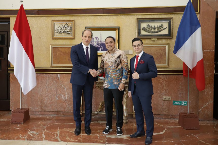 SURABAYA-Wali Kota Surabaya Eri Cahyadi bersama jajaran Pemerintah Kota (Pemkot) Surabaya menyambut dengan hangat kedatangan rombongan Duta Besar Prancis Fabien Penone bersama jajarannya di ruang kerja Wali Kota Surabaya, Selasa (18/7/2023). Dalam pertemuan tersebut, banyak hal yang dibahas, sehingga Duta Besar Prancis menjadikan Kota Surabaya sebagai prioritas kerjasama antara Indonesia dengan Prancis.