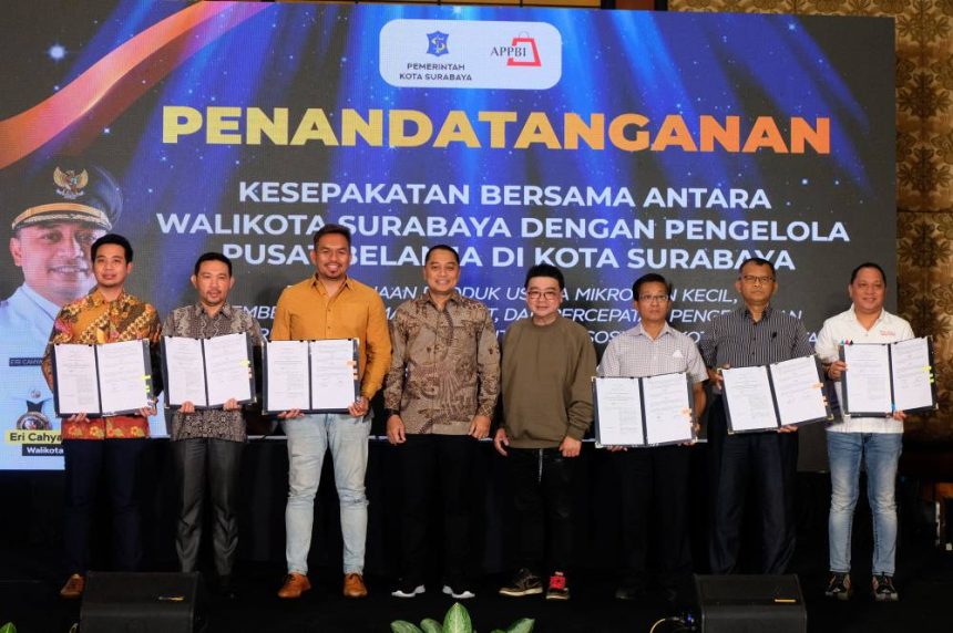 SURABAYA-Wali Kota Surabaya Eri Cahyadi menandatangani kesepakatan bersama dengan 32 pengelola pusat belanja di Hotel Sheraton, Senin (10/4/2023). Dalam penandatanganan tersebut, Wali Kota Eri Cahyadi turut disaksikan oleh Ketua Asosiasi Pengelola Pusat Belanja Indonesia (APPBI) Jawa Timur, Sutandi Purnomosidi.