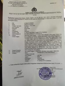 Bukti laporan resmi tercatat dalam Surat Tanda Bukti Laporan Nomor: LP/B/150/III/2025/SPKT/Polsek Sawahan/Polrestabes Surabaya/Polda Jatim. Terlapor diketahui beralamat di Jalan Girilaya 5/27-A Surabaya dan disebut tidak memiliki pekerjaan tetap.